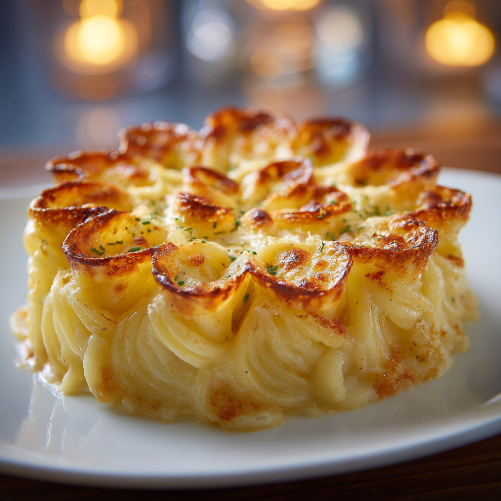Imaginez un plat qui soit à la fois un régal pour les yeux et pour les papilles. C’est exactement ce que propose ce sublime gratin de pâtes en forme de fleur. Bien plus qu’un simple gratin, cette recette transforme un classique de la cuisine familiale en une véritable œuvre d’art comestible. Dès la sortie du four, son parfum envoûtant de sauce tomate mijotée, d’herbes aromatiques et de fromage doré et bouillonnant embaumera votre cuisine, promettant un moment de pur réconfort. La texture est tout aussi divine : des pâtes tendres dressées à la verticale, généreusement farcies d’une sauce riche et savoureuse, le tout nappé d’une couche de fromage filant et gratiné à la perfection. C’est le plat idéal pour surprendre votre famille ou impressionner vos amis lors d’un dîner, sans pour autant passer des heures en cuisine.