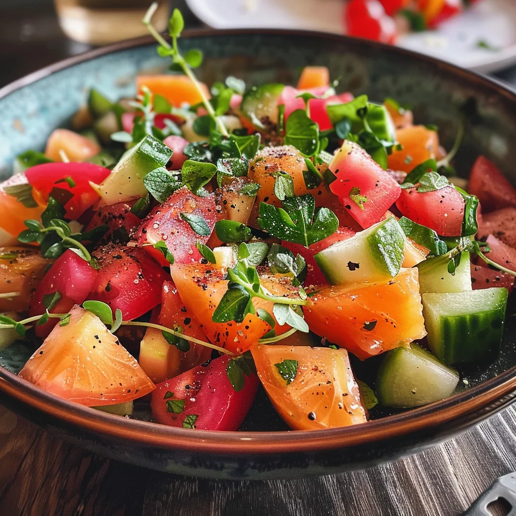 - Faites-la reposer : Ne sous-estimez pas le pouvoir de la marinade ! Laisser la salade reposer 10-15 minutes (voire une heure au frigo) permet aux saveurs de pénétrer les légumes et de se marier magnifiquement.
