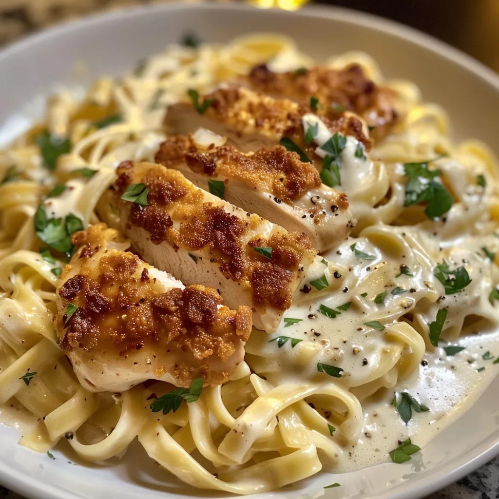 - Servez immédiatement les tagliatelles topped avec le poulet crispy, et parsemez de persil frais haché pour terminer.