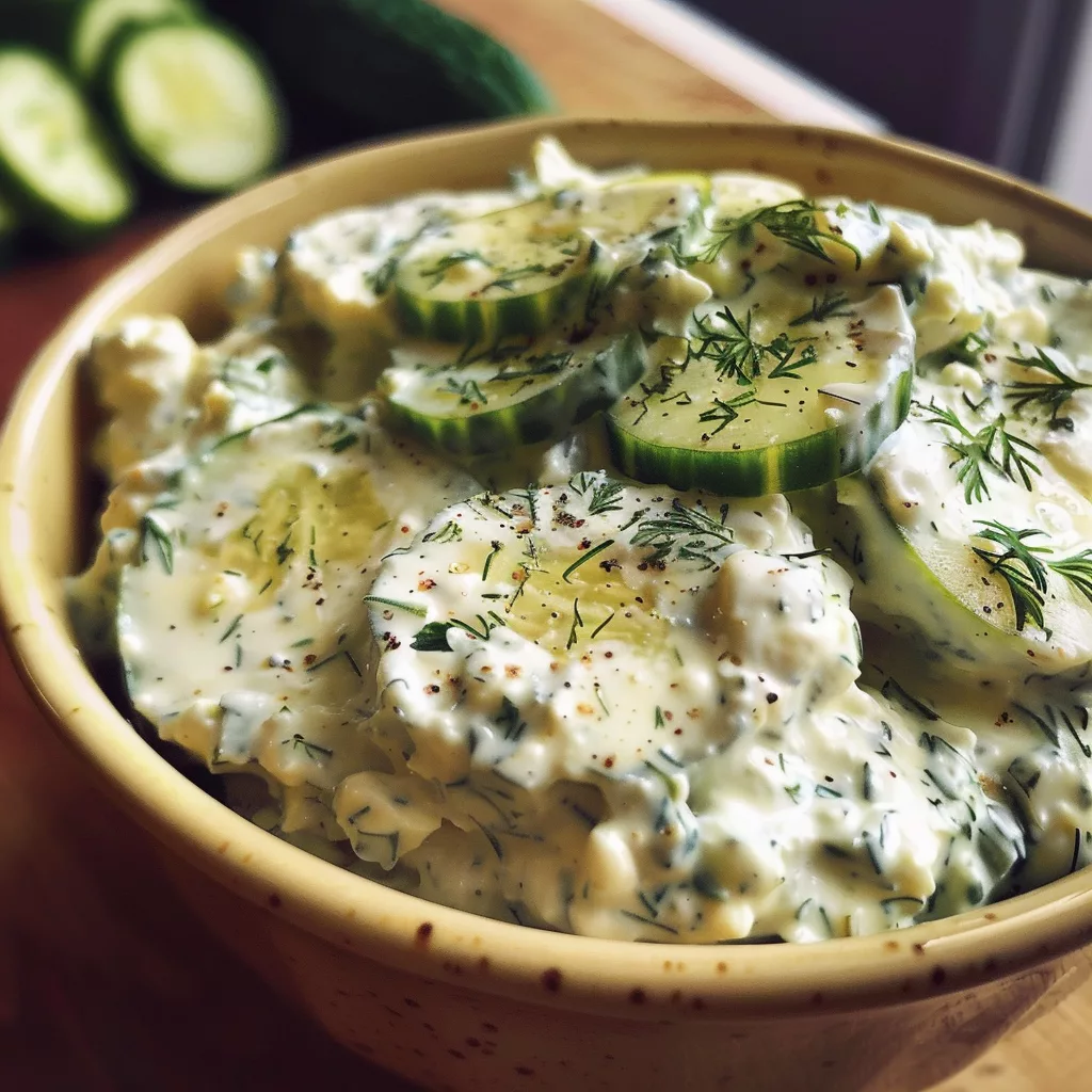 - Finaliser : Versez la sauce aux herbes sur les concombres bien égouttés. Mélangez délicatement avec une spatule jusqu’à ce que chaque brin de concombre soit enrobé de crème. Servez immédiatement pour une fraîcheur maximale, ou réfrigérez jusqu’au moment de servir.